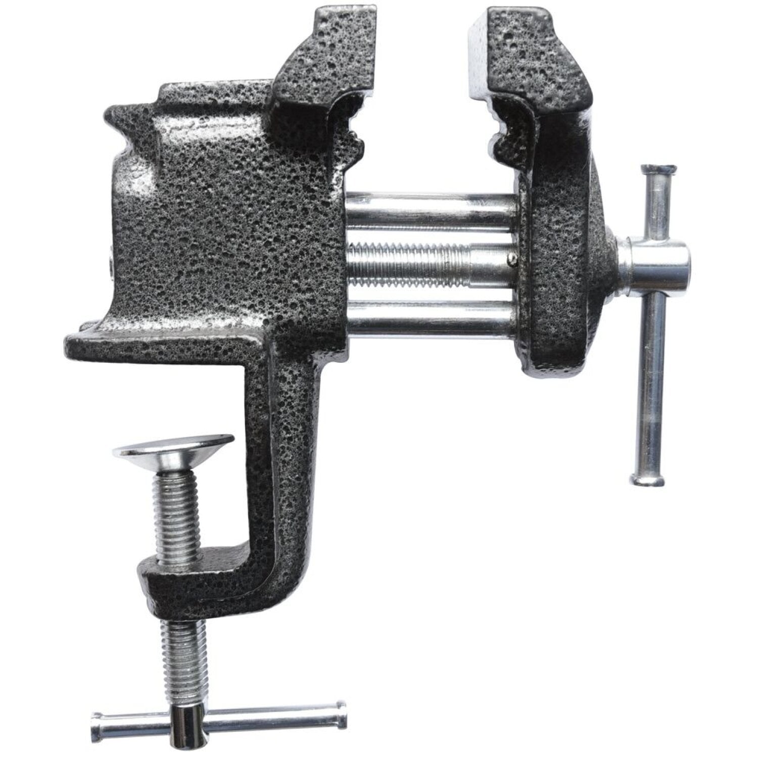 When bench space is at a premium this vise is the perfect answer Completely portable and ideal for light duty work. This clamp attaches to surfaces up to 1.5" thick. Cast in pipe jaws, serrated jaw faces, and double steel guide bars.Opening capacity: 3"