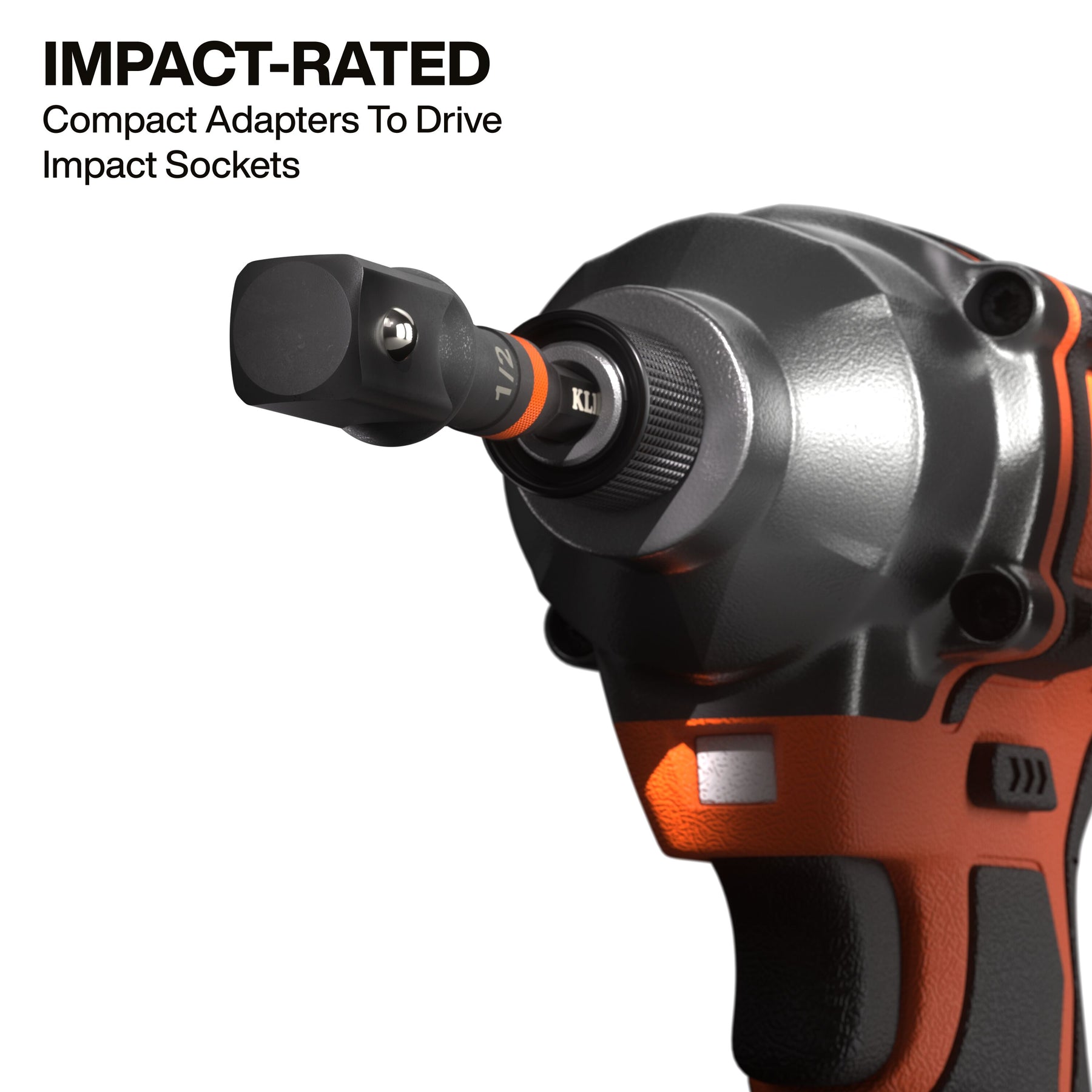 Klein Tools 3-Inch Impact Socket Adapter Set includes 1/4, 3/8, and 1/2-Inch square drive sizes for quick conversion from impact drivers to sockets. The knurled grip provides steady handling, even with oily or gloved hands, while the high-visibility orange band makes it easy to spot in a tool bag or dimly lit jobsites.