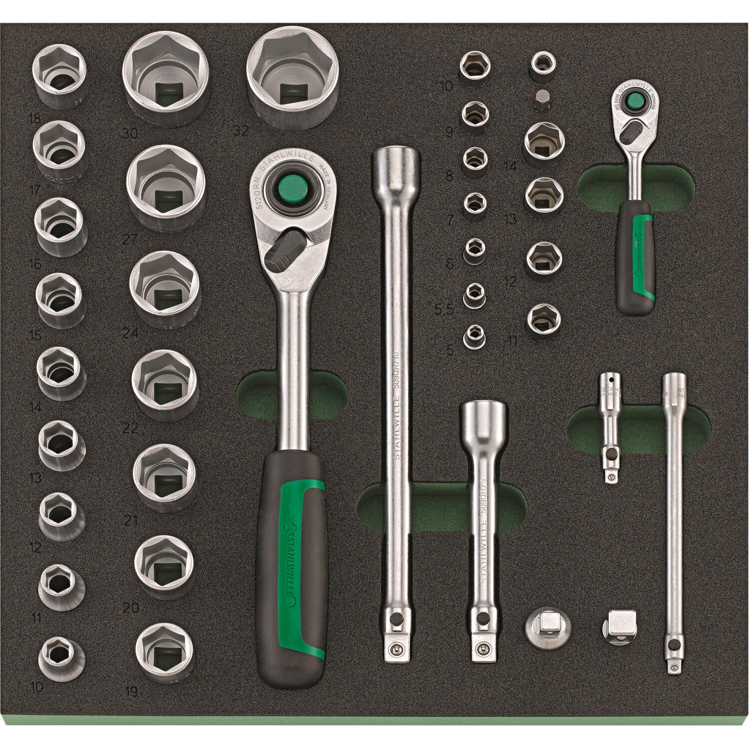 - Comprehensive set for the highest demands: QR fine-tooth ratchets with extensions, sockets up to 32 mm, bit ratchet screwdriver and bit box, screwdriver, various pliers and much more.
