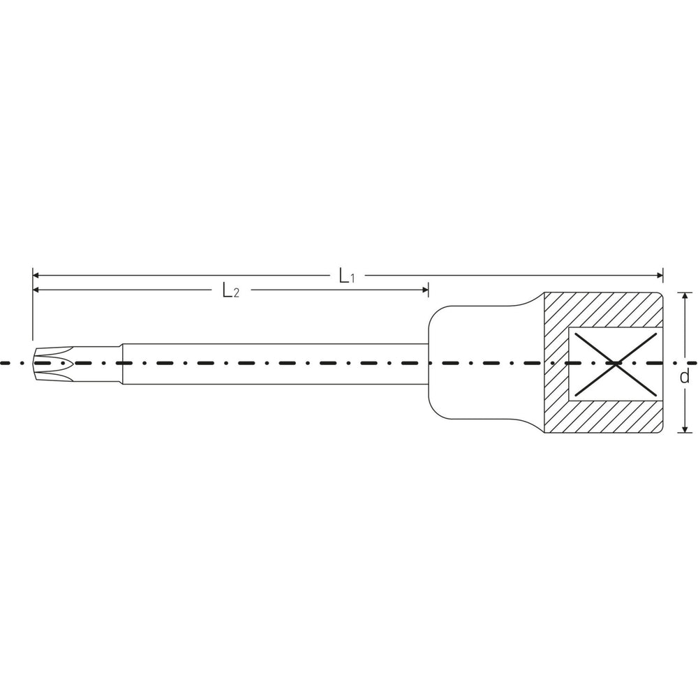 Extra long design for recessed TORX screws. With 1/2" internal square drive. Made of Chrome Alloy Steel and chrome-plated.